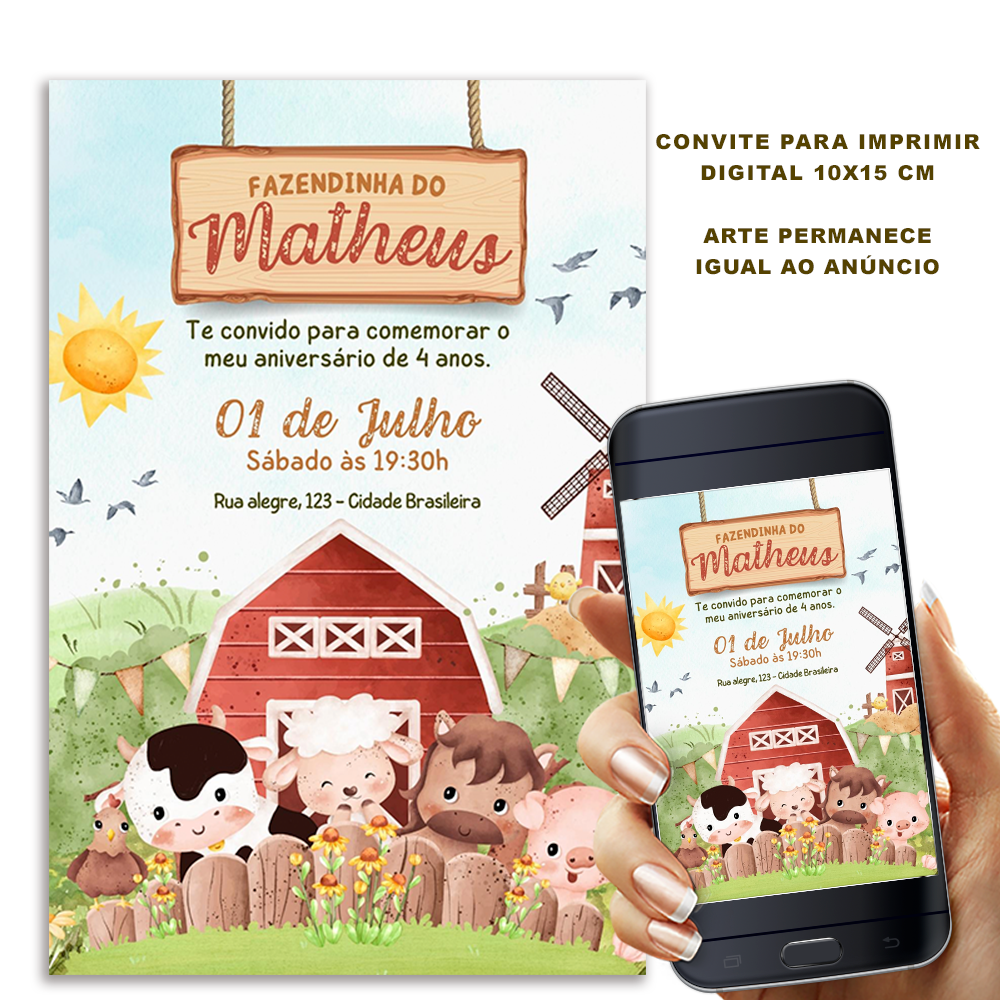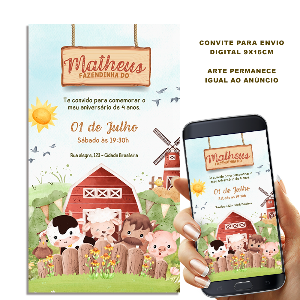 1 Convite Fazendinha, no tamanho escolhido na hora da compra, arquivo de imagem digital não editável, igual ao modelo e preenchido com os dados do seu evento.
